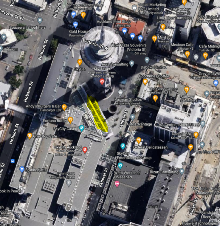 0915 Departing Auckland Sky City Bus Terminal NOW CHANGED TO Sky City Hotel, Coner Victoria and Federal Streets Aukland to Copthorne Hotel & Resort Bay of Islands see attached document for visual of pick up area next to the Sky Tower. See image of pick-up spot here.